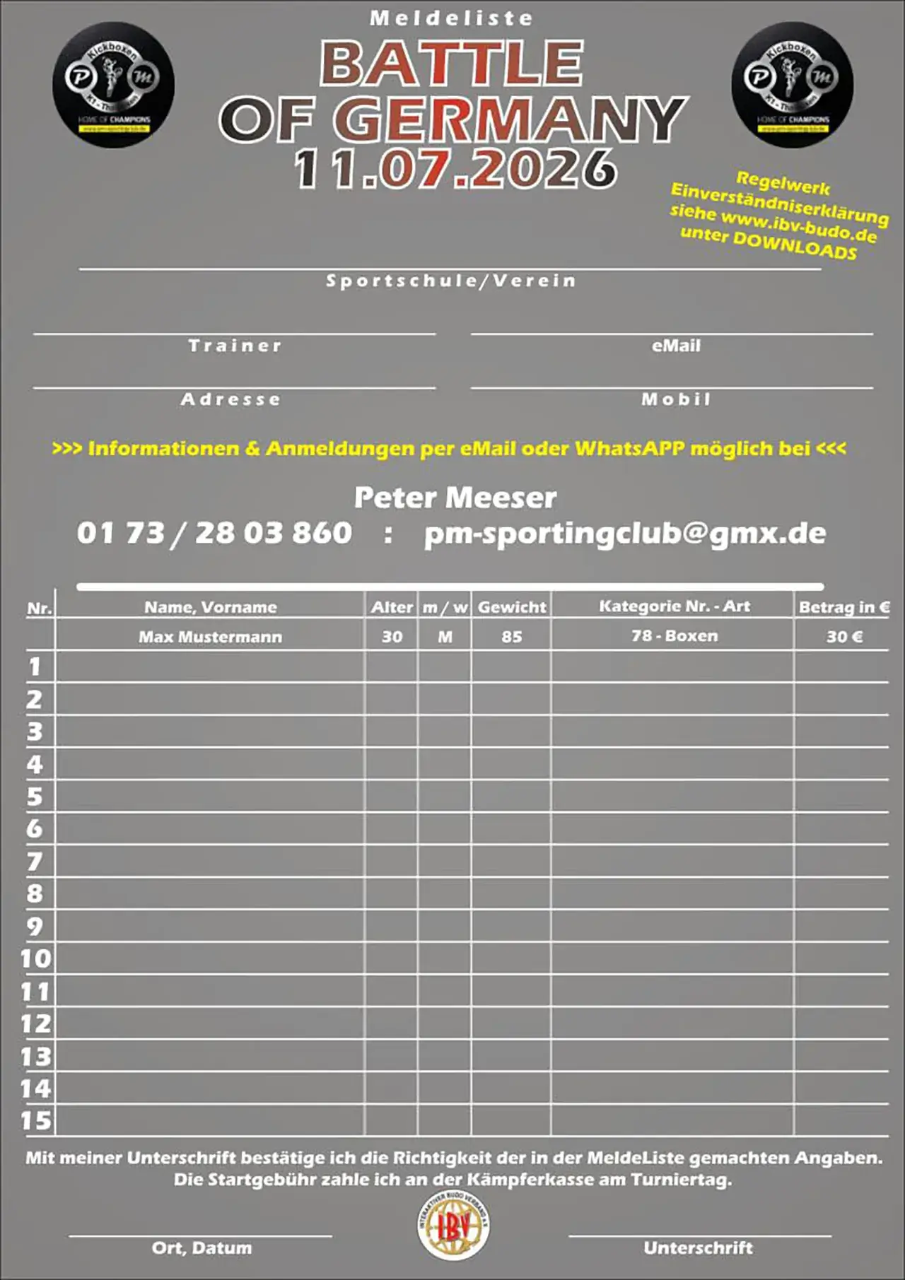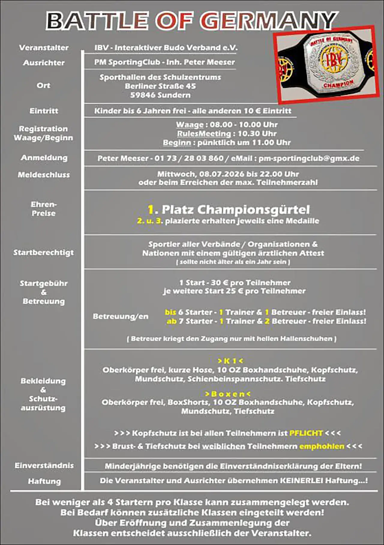 Am Samstag, den 11. Juli 2026, lädt der Interaktive Budo Verband e. V. (IBV) gemeinsam mit dem PM Sporting Club zum deutschlandweiten Vollkontakt-Turnier „Battle of Germany“ nach Sundern ein.