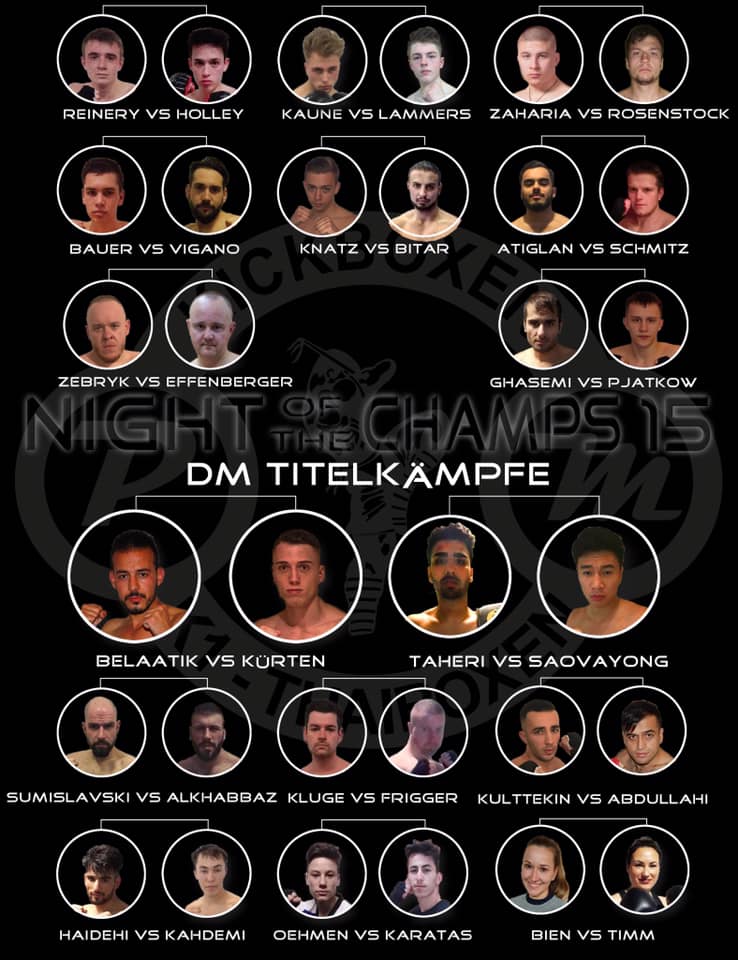 Der Vorverkauf für die 15te „Night of the Champs“ ist beendet und Morgen ist es endlich soweit. Hier eine Übersicht der Kämpfe für den morgigen Abend im schönen Schmallenberg/Gleidorf.